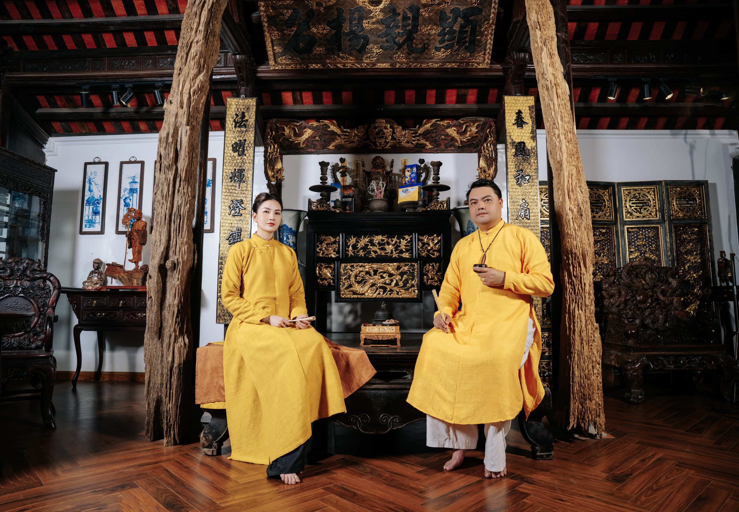 Chụp ảnh mẫu cô gái áo dài thiết kế vàng