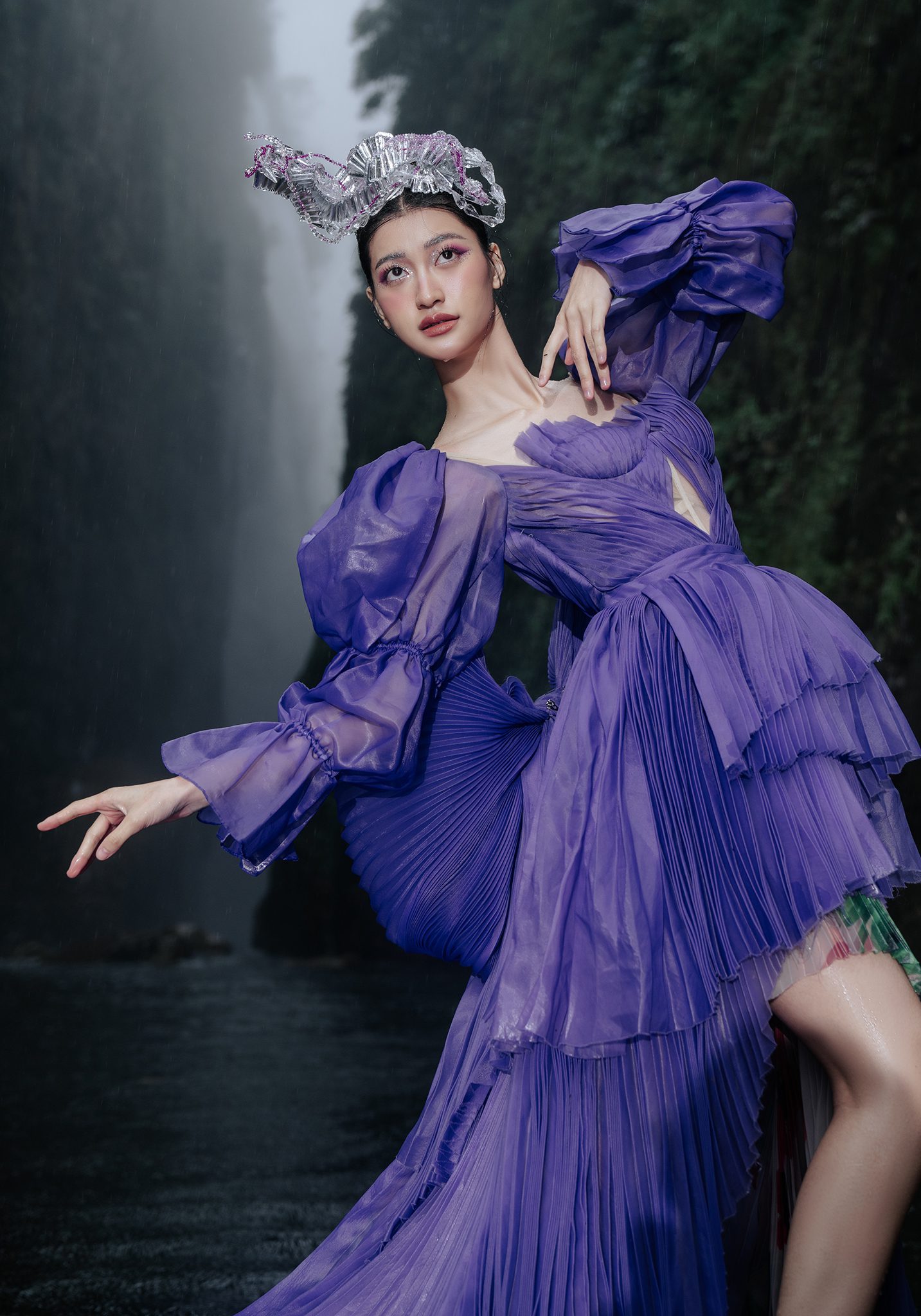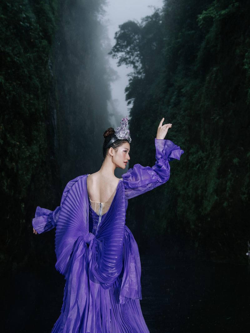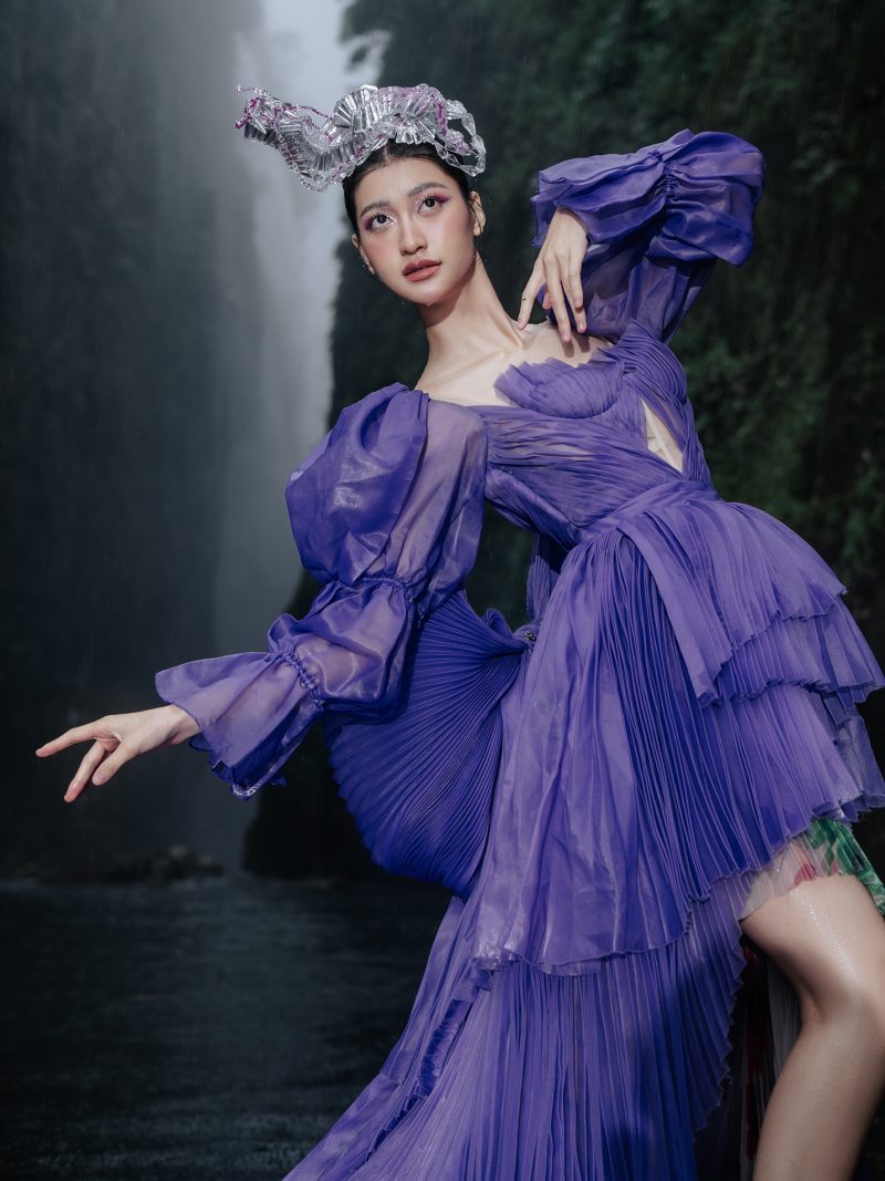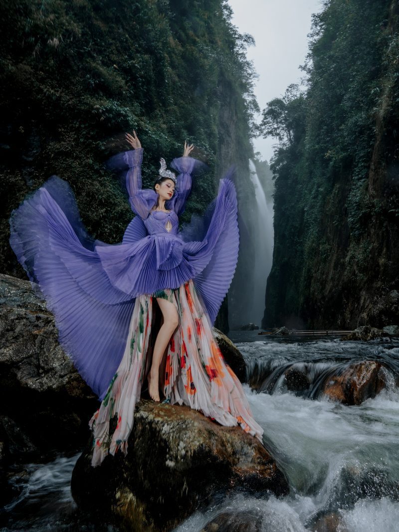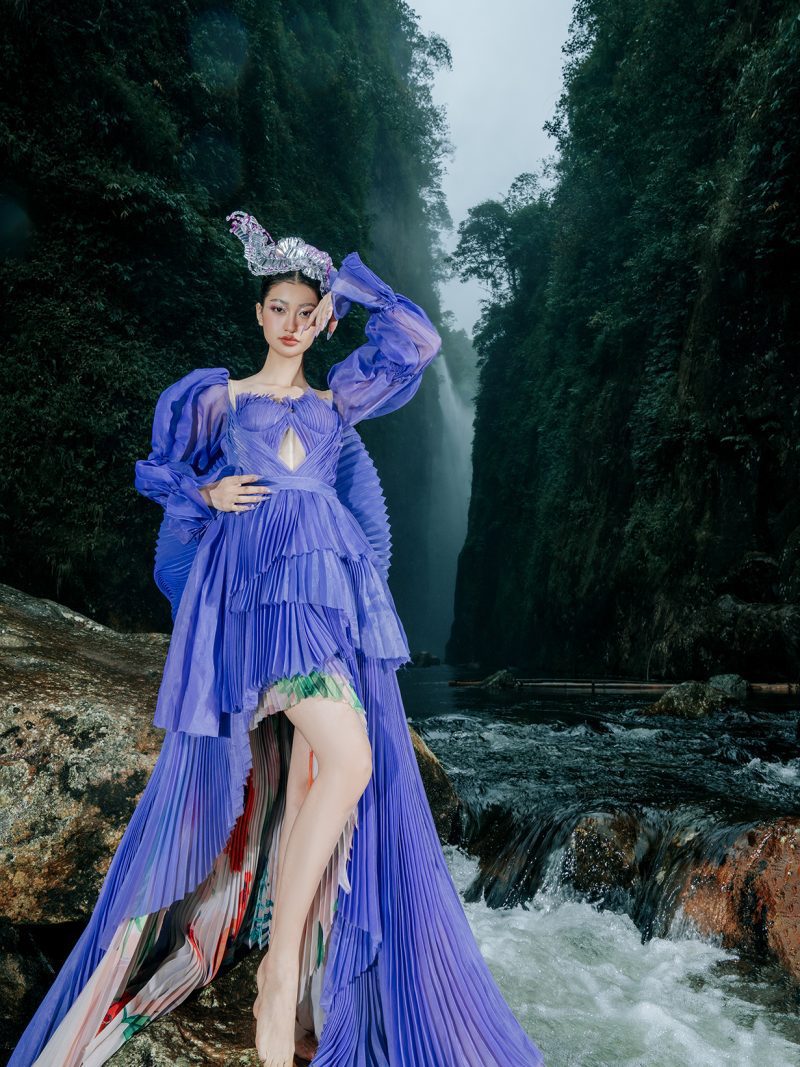 Trong không gian rừng sâu phủ đầy hơi nước, nàng thơ khoác lên mình chiếc váy tím mềm mại như đang hòa vào nhịp thở của thiên nhiên. Dáng pose uyển chuyển tựa một vũ điệu lặng lẽ bên dòng thác, kết hợp cùng ánh nhìn xa xăm tạo nên vẻ đẹp vừa mong manh vừa cuốn hút. Sự tương phản giữa gam tím nổi bật và nền rừng xanh thẫm khiến bức ảnh trở nên đầy chất thơ và huyền ảo.