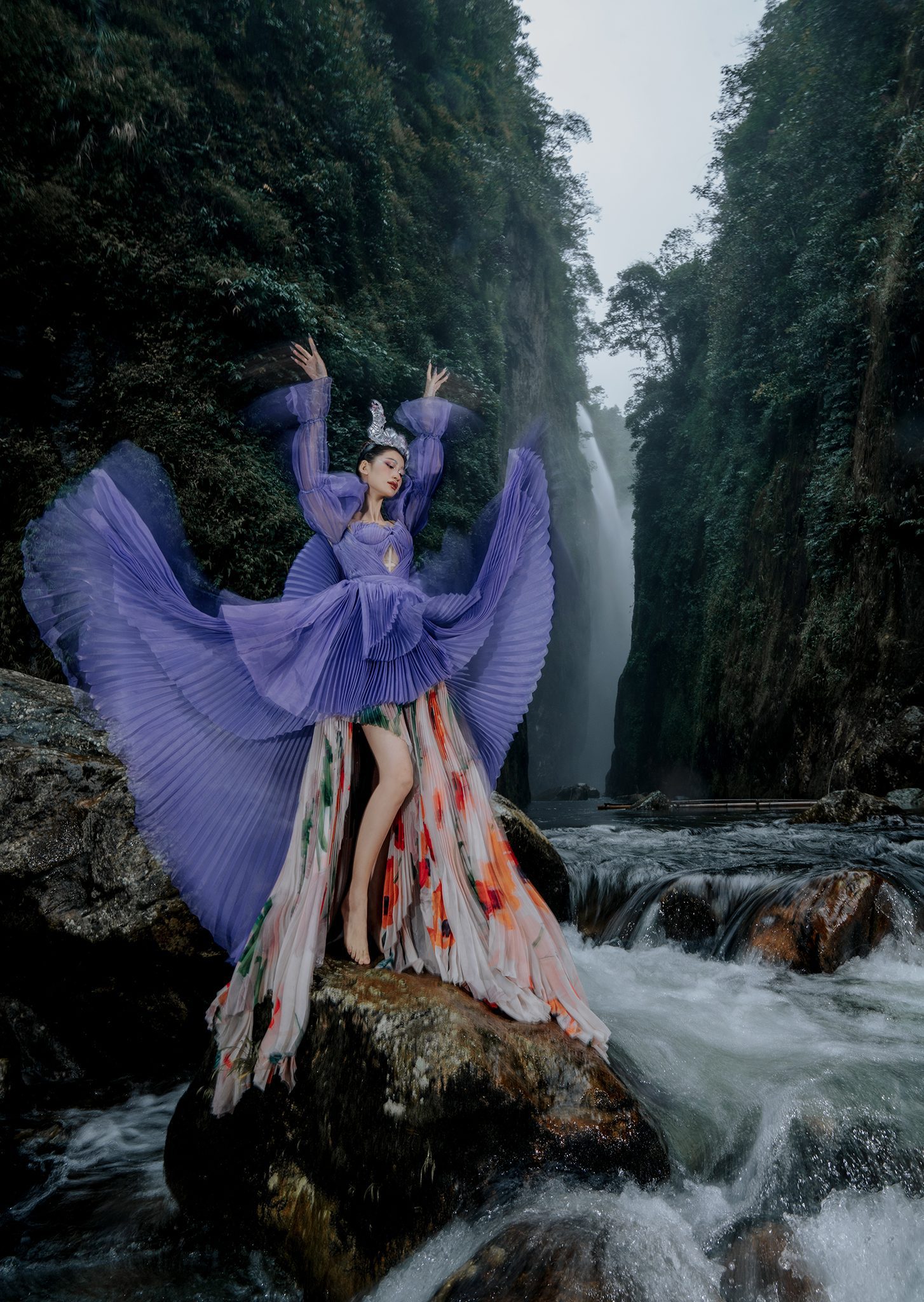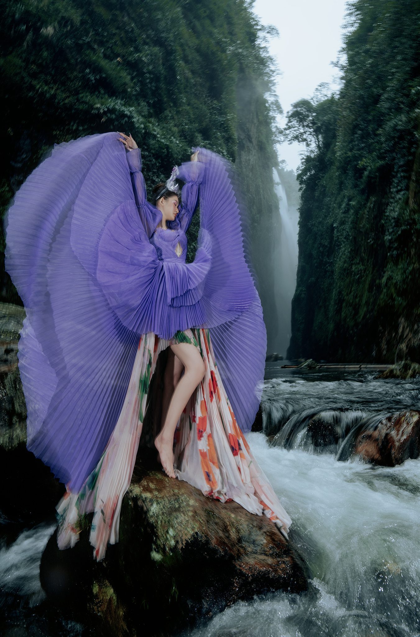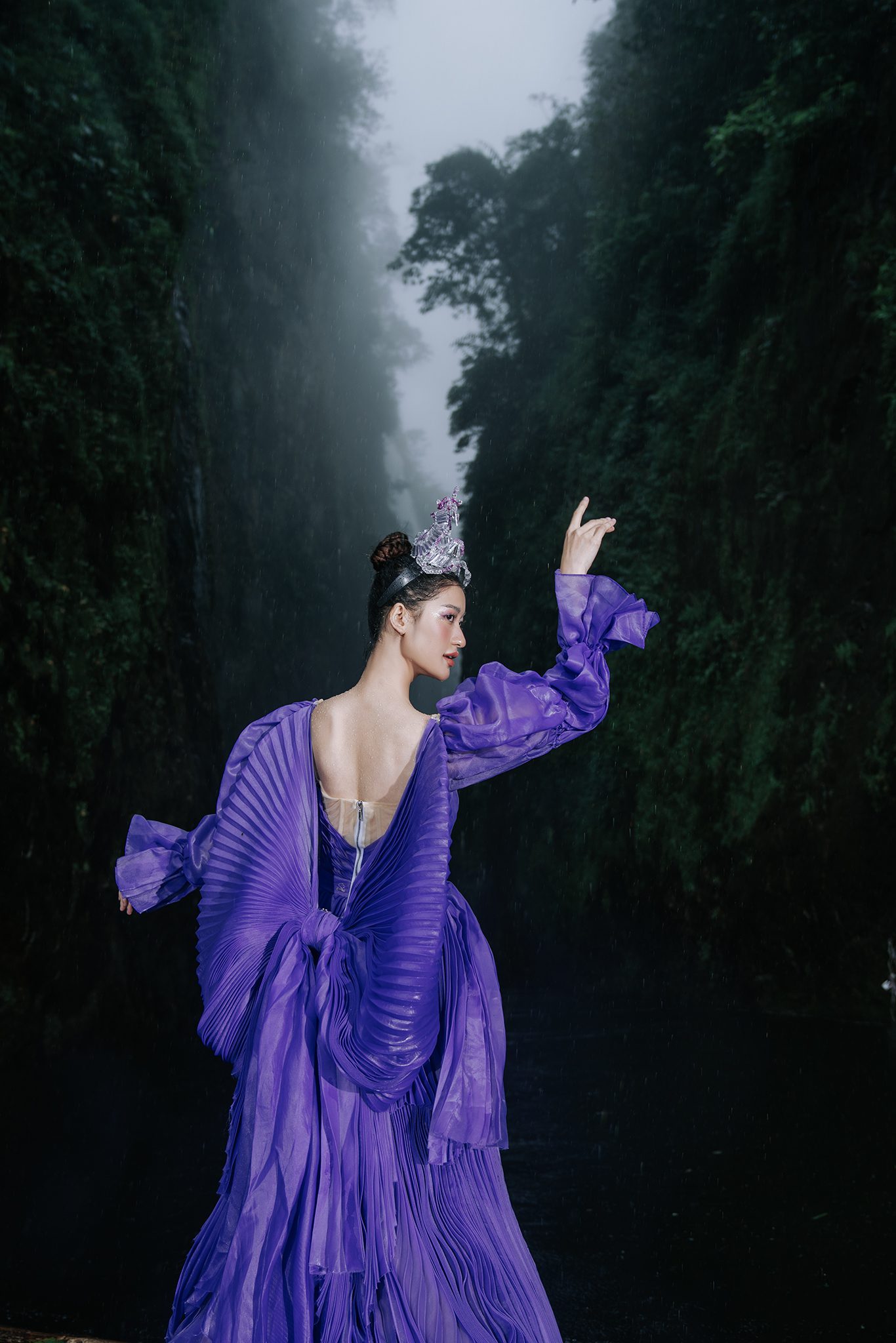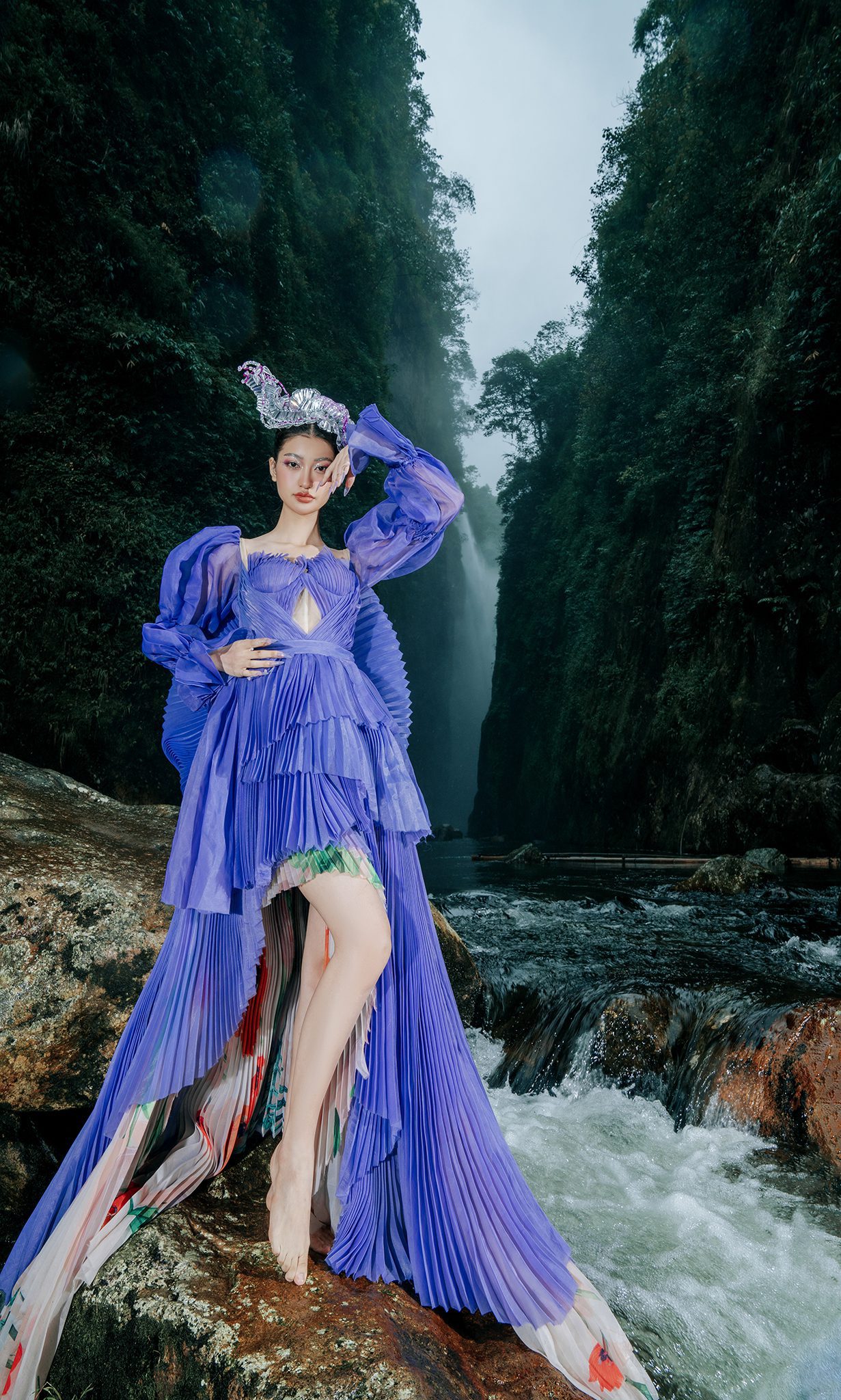 Trong không gian rừng sâu phủ đầy hơi nước, nàng thơ khoác lên mình chiếc váy tím mềm mại như đang hòa vào nhịp thở của thiên nhiên. Dáng pose uyển chuyển tựa một vũ điệu lặng lẽ bên dòng thác, kết hợp cùng ánh nhìn xa xăm tạo nên vẻ đẹp vừa mong manh vừa cuốn hút. Sự tương phản giữa gam tím nổi bật và nền rừng xanh thẫm khiến bức ảnh trở nên đầy chất thơ và huyền ảo.