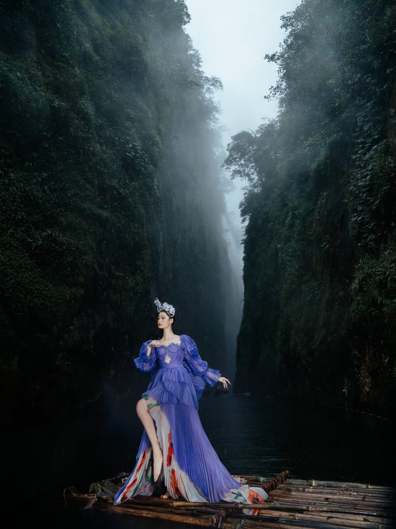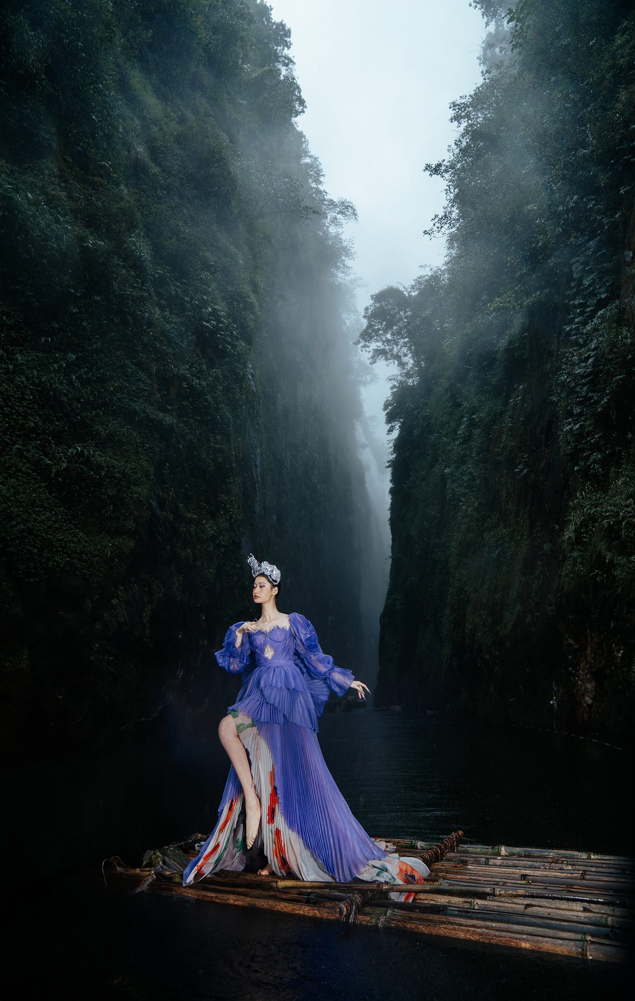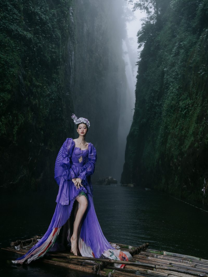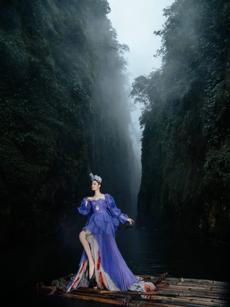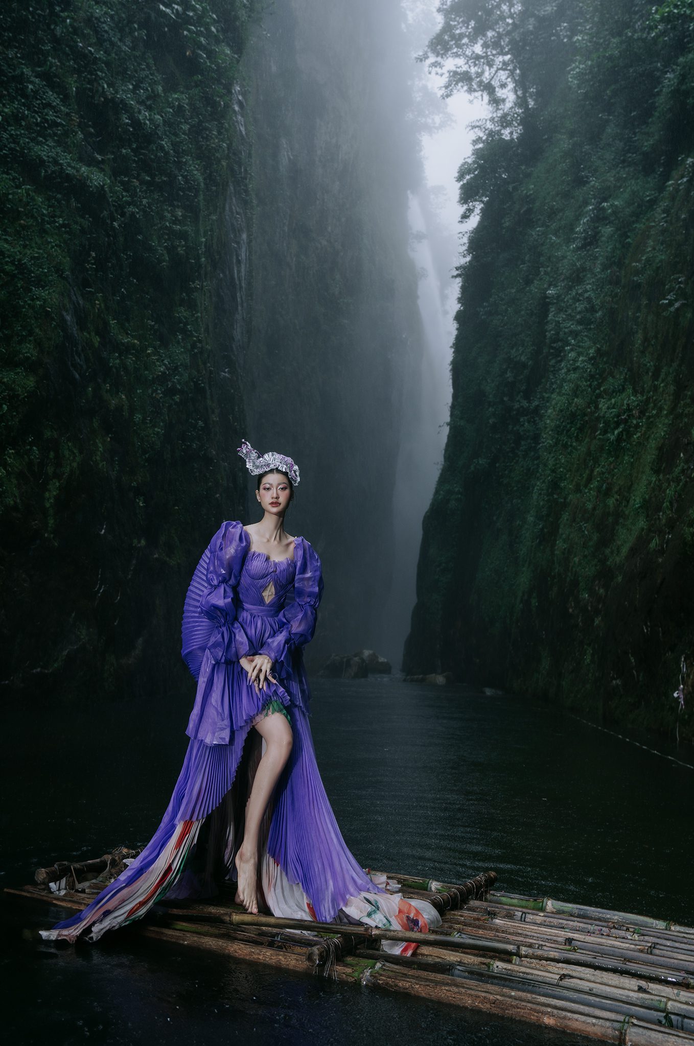 Trong không gian rừng sâu phủ đầy hơi nước, nàng thơ khoác lên mình chiếc váy tím mềm mại như đang hòa vào nhịp thở của thiên nhiên. Dáng pose uyển chuyển tựa một vũ điệu lặng lẽ bên dòng thác, kết hợp cùng ánh nhìn xa xăm tạo nên vẻ đẹp vừa mong manh vừa cuốn hút. Sự tương phản giữa gam tím nổi bật và nền rừng xanh thẫm khiến bức ảnh trở nên đầy chất thơ và huyền ảo.