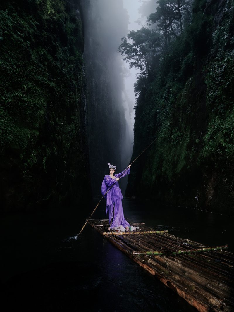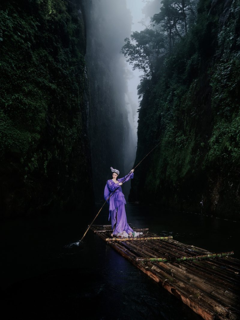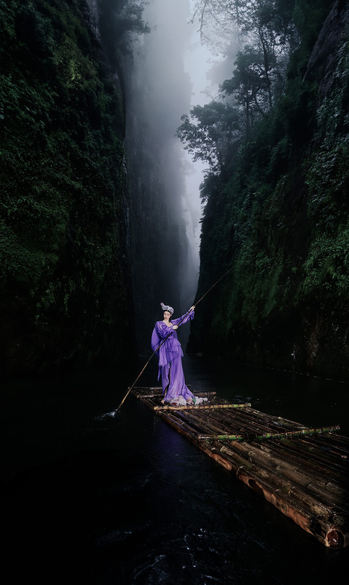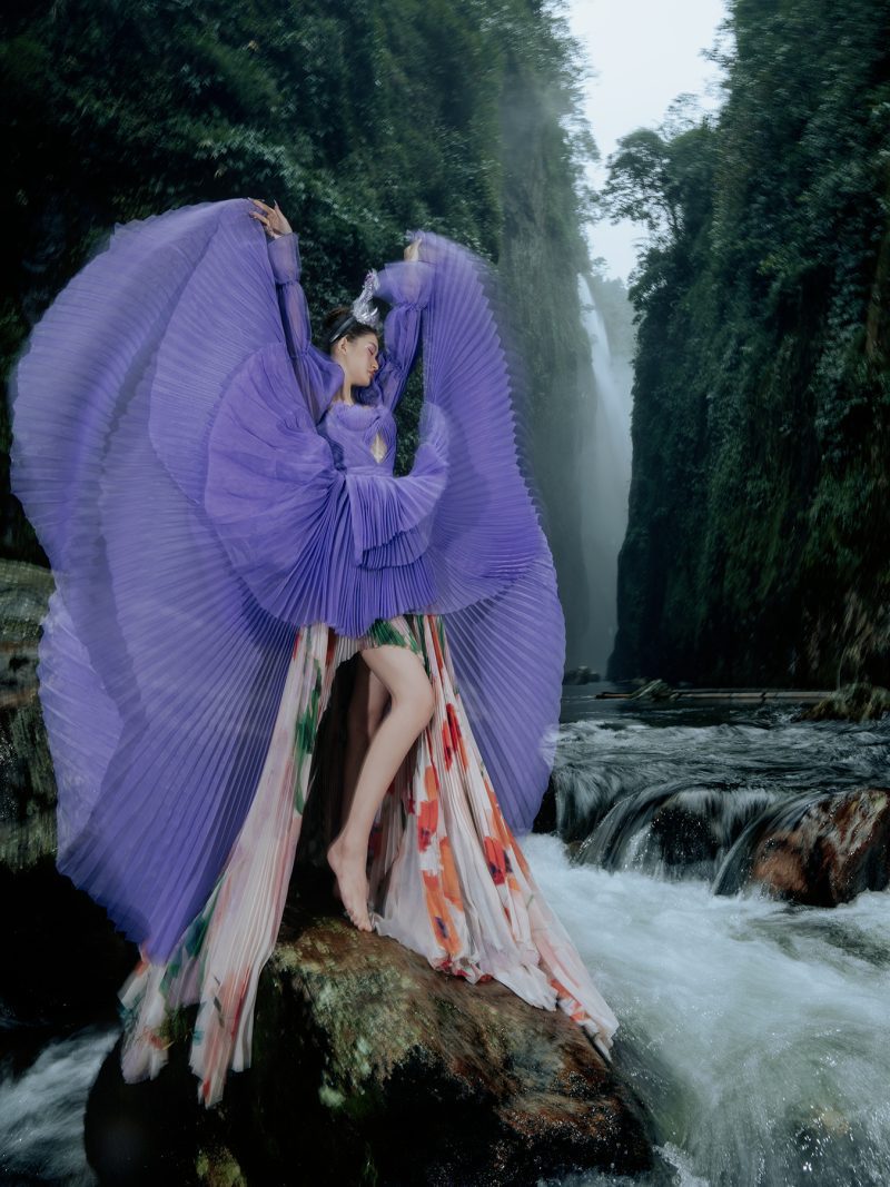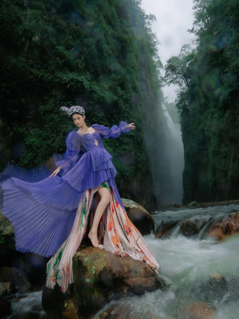 Trong không gian rừng sâu phủ đầy hơi nước, nàng thơ khoác lên mình chiếc váy tím mềm mại như đang hòa vào nhịp thở của thiên nhiên. Dáng pose uyển chuyển tựa một vũ điệu lặng lẽ bên dòng thác, kết hợp cùng ánh nhìn xa xăm tạo nên vẻ đẹp vừa mong manh vừa cuốn hút. Sự tương phản giữa gam tím nổi bật và nền rừng xanh thẫm khiến bức ảnh trở nên đầy chất thơ và huyền ảo.
