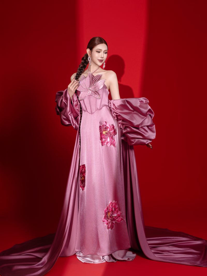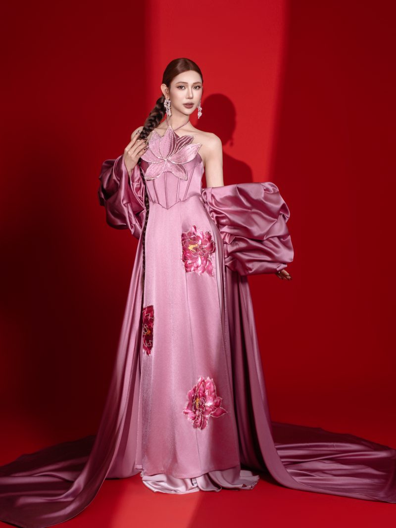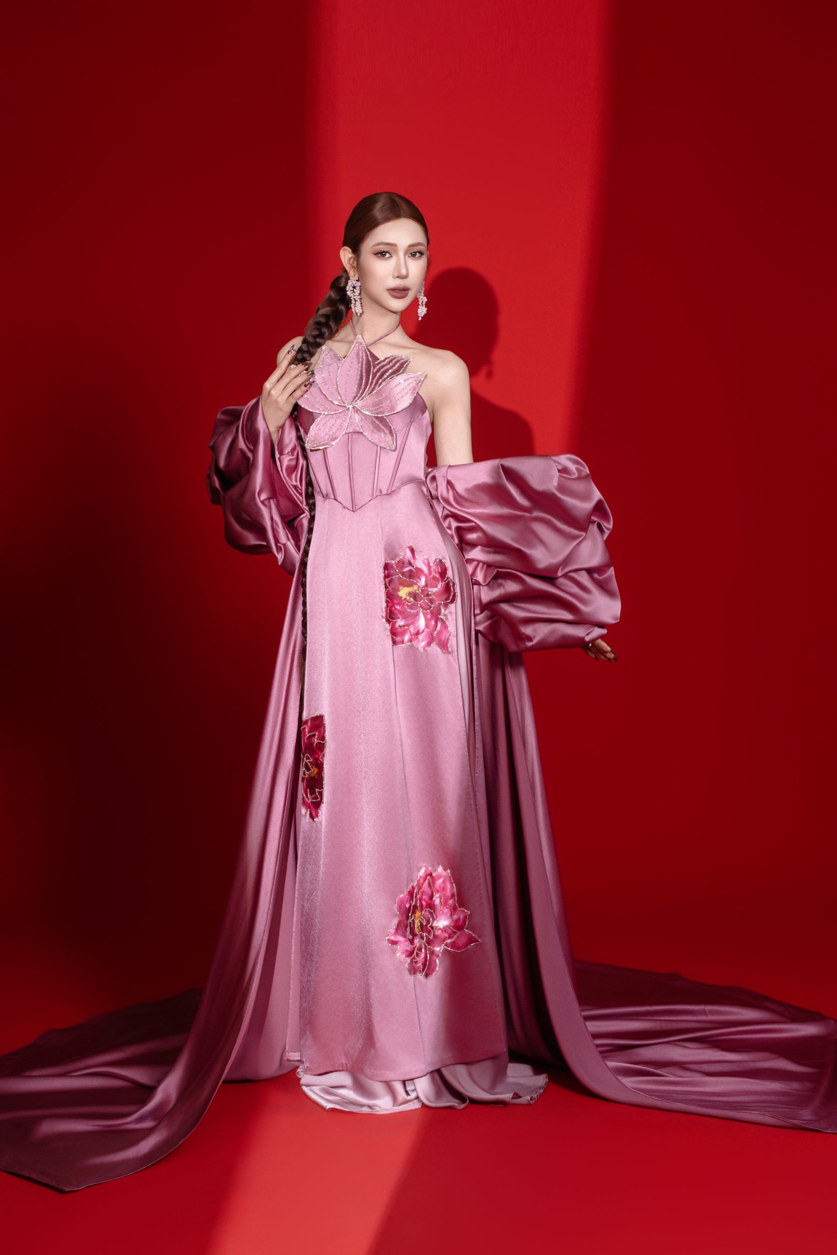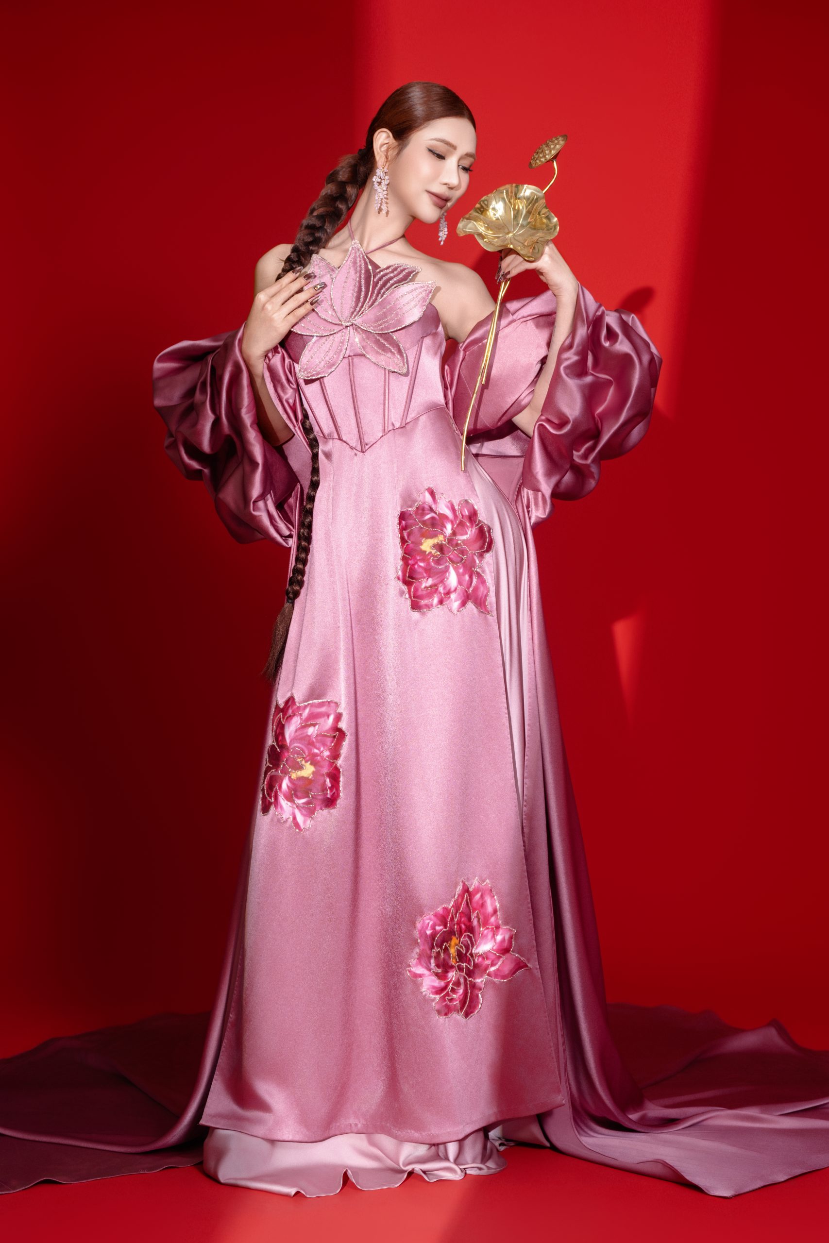 Người mẫu bước ra, khoác trên mình chiếc áo dài thiết kế màu hồng dịu dàng, điểm xuyết những bông hoa sen thêu nổi tinh xảo. Tà áo lụa mềm mại khẽ lay động theo từng bước chân, như mang theo cả sự thanh khiết và nữ tính. Cô nhẹ nhàng cầm một cành sen vàng, ánh mắt khép hờ, toát lên vẻ đẹp vừa cổ điển vừa hiện đại.