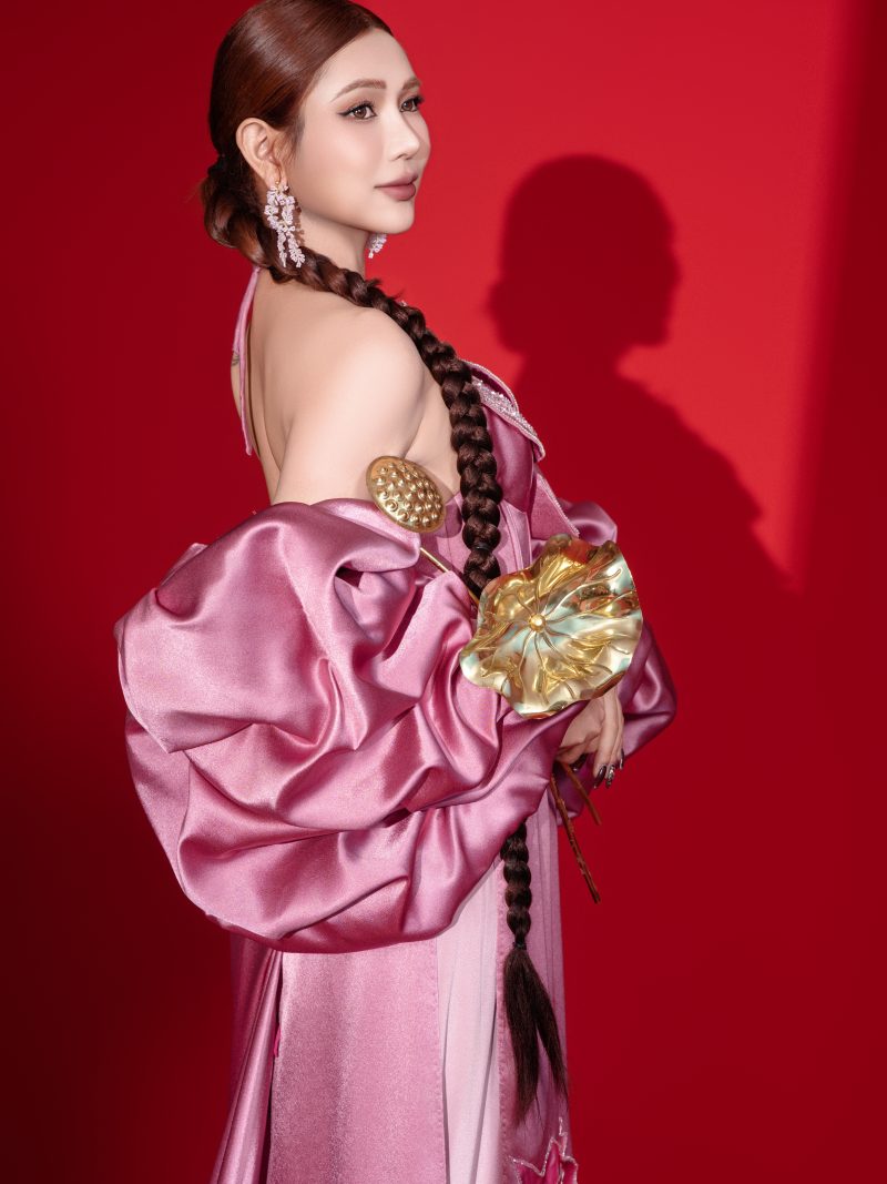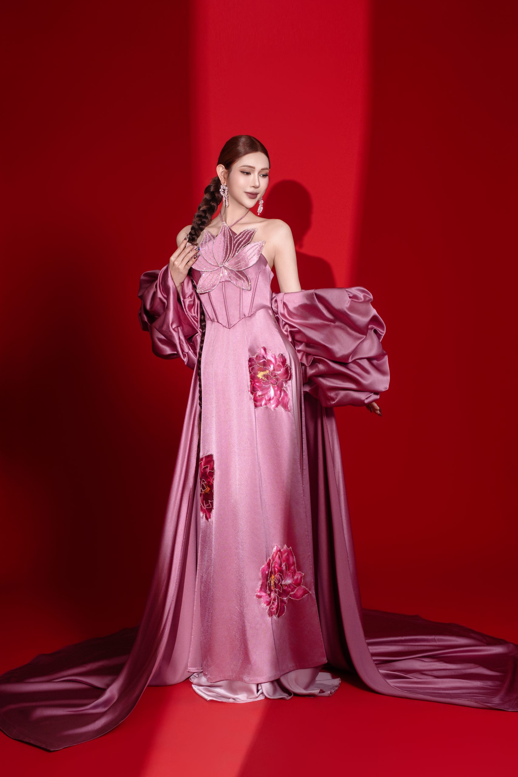 Tôi bắt đầu bấm máy. Mỗi góc chụp là một câu chuyện riêng. Có lúc là ánh nhìn xa xăm, có khi là nụ cười thoáng qua đầy bí ẩn. Ánh sáng được điều chỉnh tinh tế, phản chiếu trên nền vải hồng óng ả, làm nổi bật từng đường nét thiết kế độc đáo.