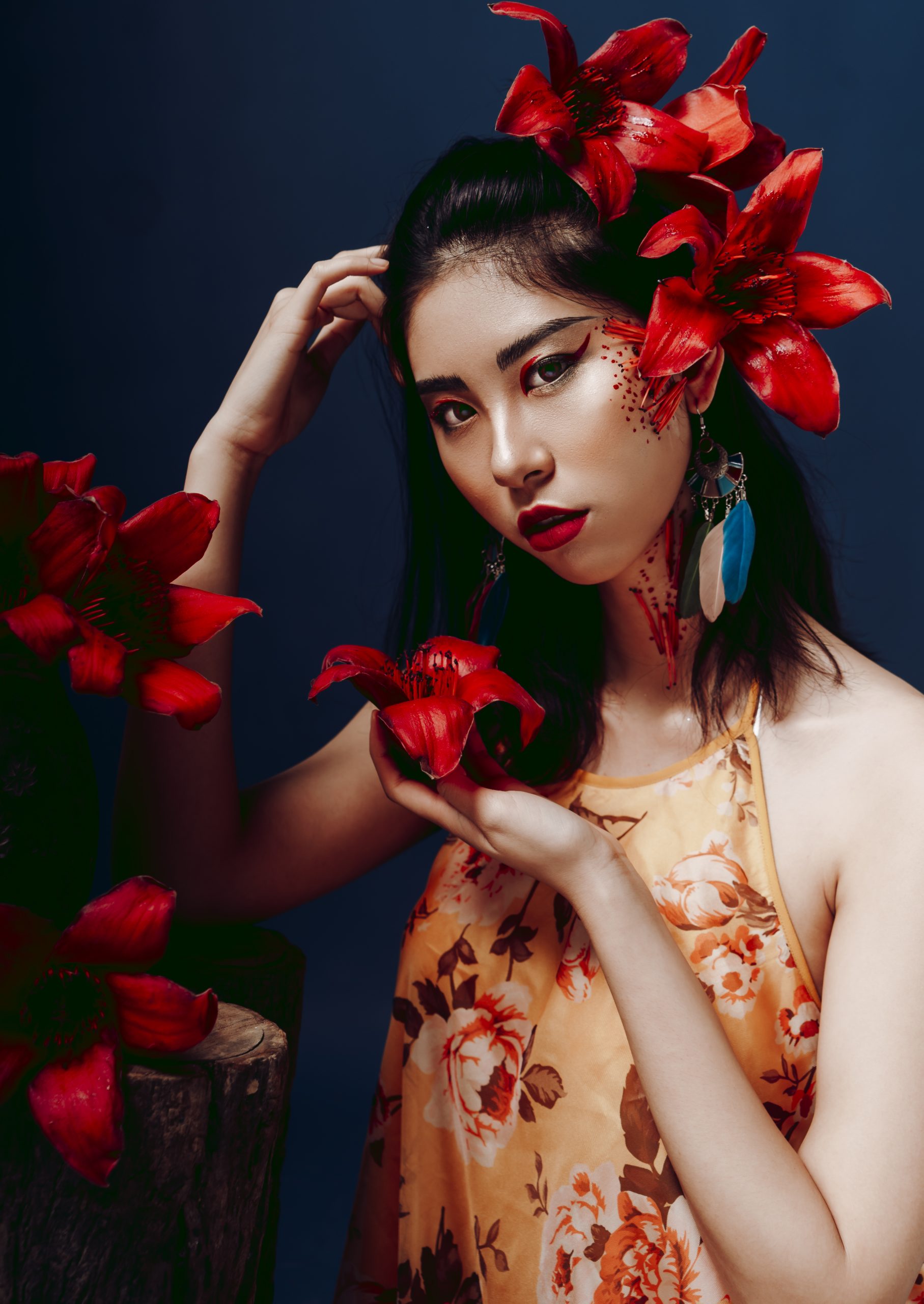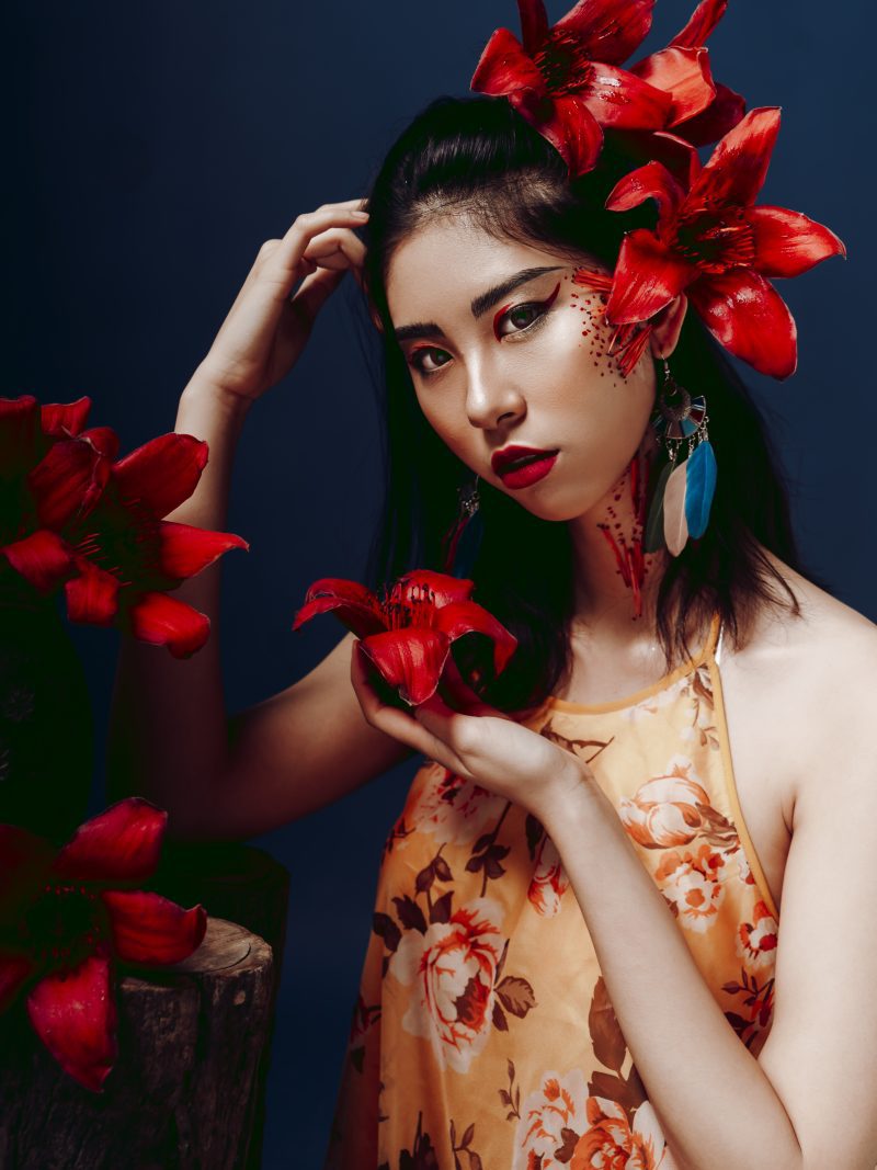 Trong studio tối lạnh, ánh sáng tập trung vào một người phụ nữ trẻ, nhưng cô ấy dường như đã mang theo cả mùa xuân rực rỡ từ bên ngoài vào. Cô ấy là cô gái hoa gạo, một nhân vật kỳ lạ và đầy mê hoặc, hóa thân từ chính những bông hoa gạo đỏ rực, nồng nàn.