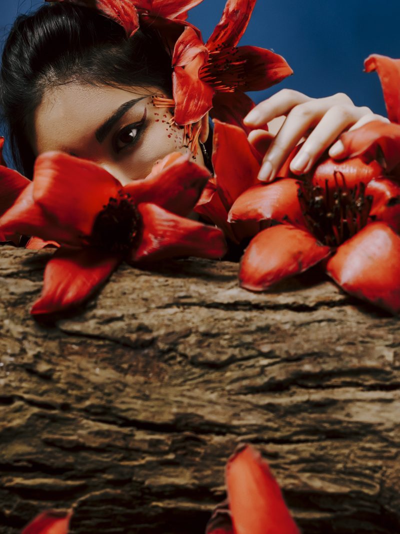 Những bông hoa gạo không chỉ là phụ kiện, chúng là một phần máu thịt, là hơi thở của cô. Chúng kết chùm trên tóc, bấu chặt vào tai cô, tạo thành những chiếc khuyên tai lộng lẫy và hoang dại. Dọc cổ và mặt cô là những vết xăm hoặc trang điểm đỏ, như những vết nứt của đất mẹ, từ đó sự sống mạnh mẽ của hoa gạo vươn lên.