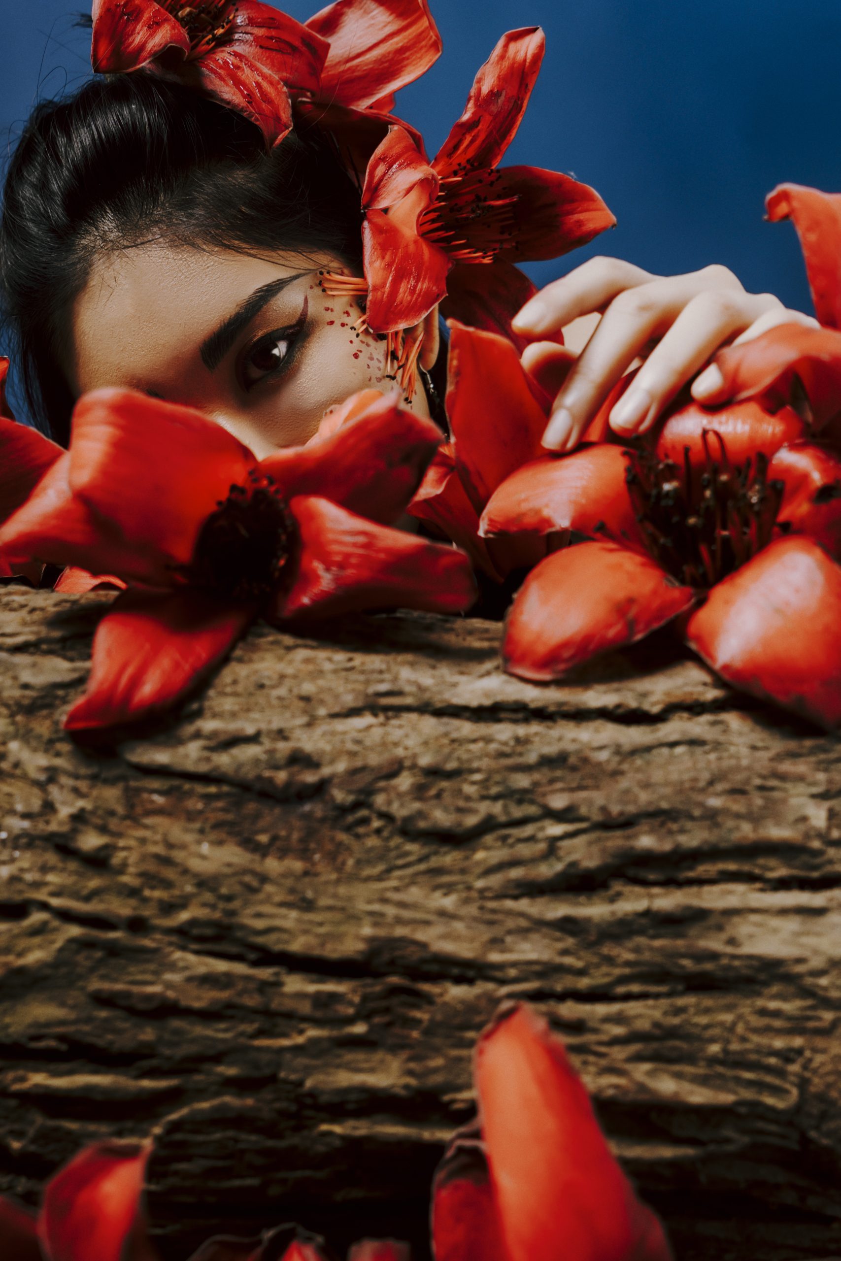 Cảm giác đầu tiên là sự nồng nàn, rực rỡ nhưng lại mang một nỗi buồn sâu thẳm. Cô gái hoa gạo đứng giữa những bông hoa, tay nâng niu một búp hoa vừa rụng, như đang giữ lại một phần linh hồn của mùa hoa. Một bức ảnh khác lại thấy cô nghiêng mình trên chiếc lọ hoa, như muốn chạm vào, muốn kết nối lại với cội nguồn. Bức ảnh chụp cận cảnh đôi mắt cô ẩn sau những bông hoa lại mang đến cảm giác bí ẩn, một sự khao khát được thấu hiểu nhưng cũng đầy e ngại.